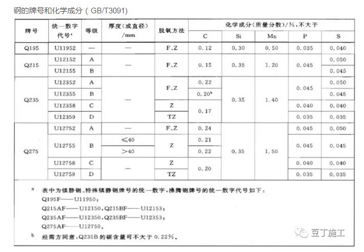(1)一般鋼 a.碳素結構鋼:(a) Q195;(b) Q215(A、B);(c) Q235(A、B、C);(d) Q255(A、B);(e) Q275。 b.低合金結構鋼 c.特定用途的一般結構鋼